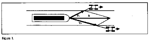 I find it helpful to begin vector graphics in terms of a series of concrete examples: abstraction and generalization can follow later. The displacement vector is easiest to explain, perhaps too easy. It is very different from other vectors such as force. Displacements are applied successively, they occupy different intervals of time, they involve a displacement through space and they are directly descriptive. Forces, on the other hand, can be applied at the same time and at the same point in space. Furthermore, the line representing a force is a geometrical analogue of the actual force and is not directly descriptive. These are important differences and there are many others. I have chosen to concentrate on the force vector here because of its importance. I choose tension in a wire or cord as the standard example of a force because it can be regarded as acting at a point. Other forces, such as surface friction and weight, are forces distributed over a surface or over a body, respectively. Suppose the force to be represented is a tension of 20 N applied by a marquee cord to a peg. The force can be represented geometrically by an arrow drawn to a suitable scale, pointing in the correct direction and applied to a definite point. I believe it is important to emphasize that the point of application of the force vector on your diagram represents a physical body. I also introduce the concept of the resultant, and the parallelogram of forces, in terms of an example such as tractors on opposite banks of a canal towing a barge. Our students will know intuitively that the combined effect of the tensions in the hauling ropes will be directed along the line of motion of the barge. It is also helpful to emphasize that both vectors represented in the graphical parallelogram are applied to the same body and at the same time. I have found that the most important point to make is that the resultant of two given forces is an imaginary force which is equivalent to the actual forces in the sense that acting alone it would have the same effect as the real forces combined. If we do not say this some may think that there are three real forces acting. We need to tell them that they must make a choice: either they deal with the original pair and ignore the resultant or they deal with the resultant and ignore the others. It is illegitimate to do both. This point can be emphasized by representing the resultant by a light line and the original forces by heavy lines (figure 1).