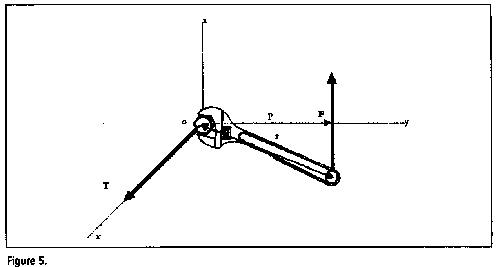 Torque and the vector product. yoz is the plane of action of the torque and ox its axis. The magnitude of the torque is given by the moment of the force F, which is equal to pF = rF sin rˆF. The conventional direction of the torque T is ox. This is symbolized by r X F = T in vector notation.